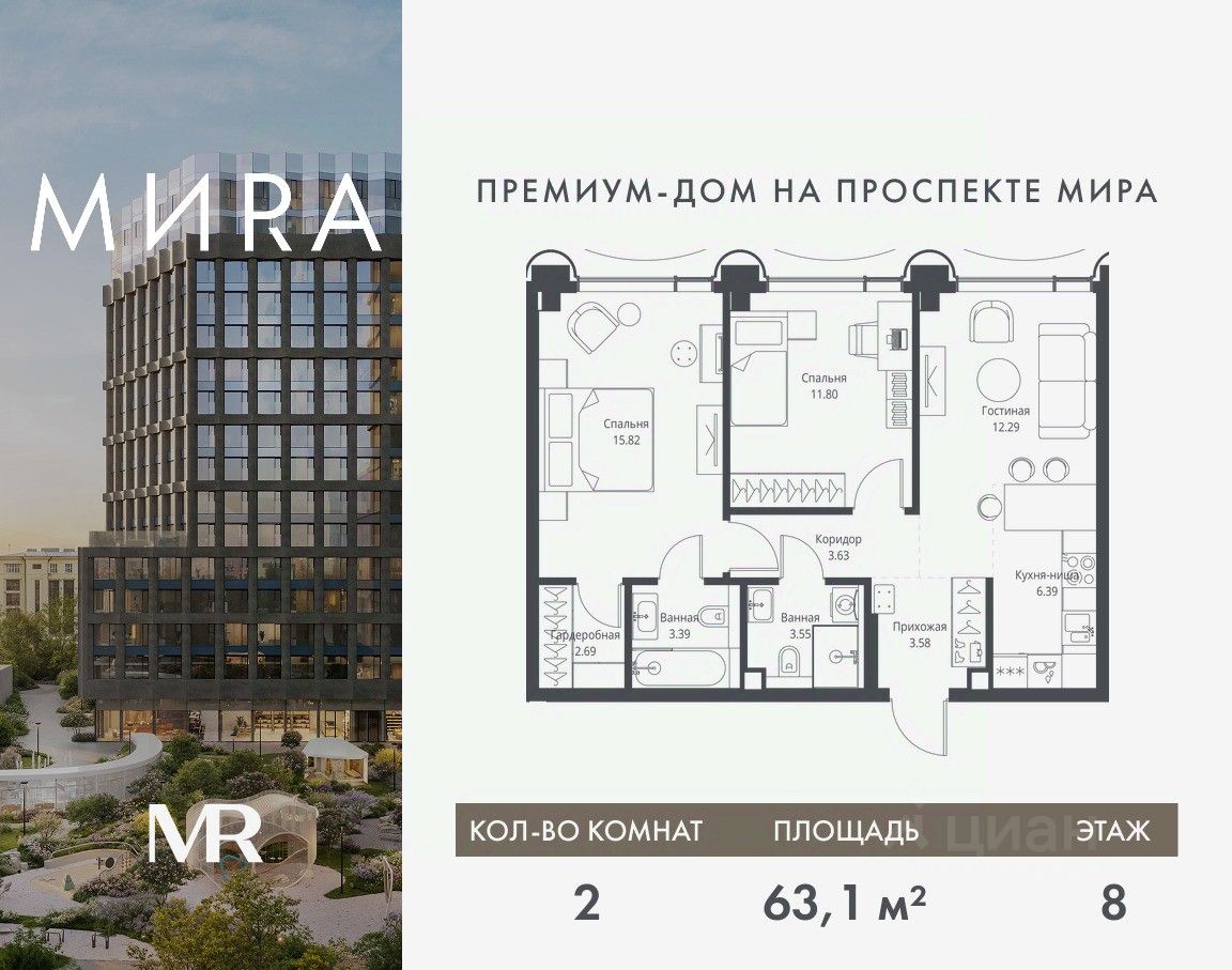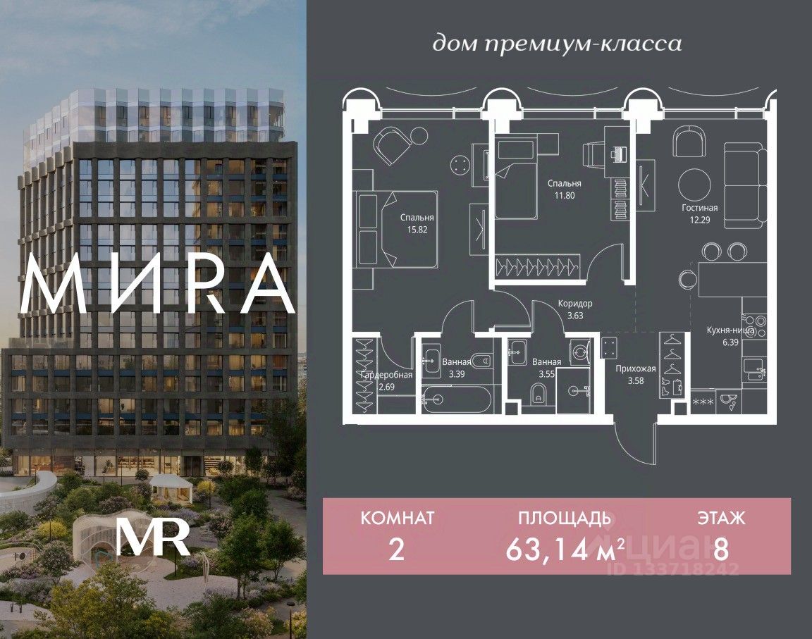 Продаётся 2-комнатная квартира общей площадью 63.14 м² без отделки в доме премиум-класса МИRА на 8-м этаже 17 этажного дома. Квартира расположена в корпусе 1.