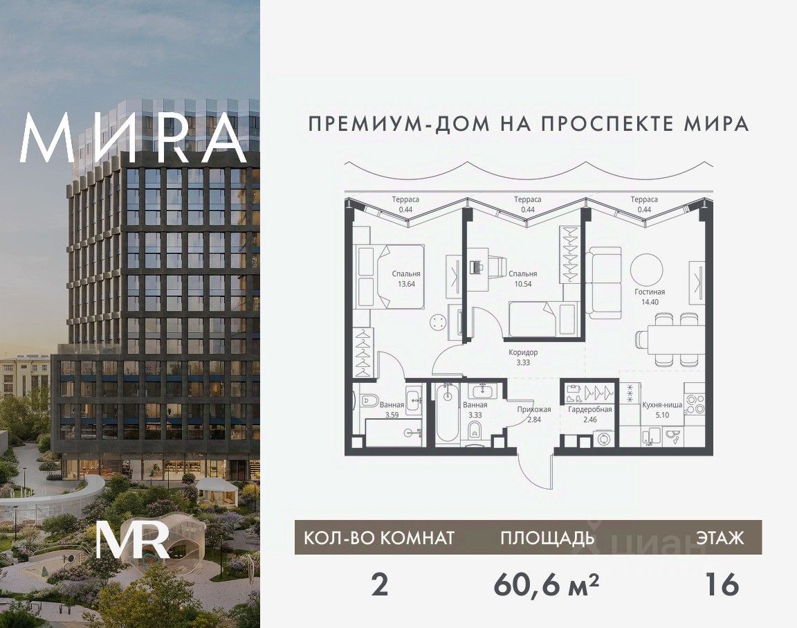 Продаётся 2-комнатная квартира общей площадью 60.55 м² без отделки в доме премиум-класса МИRА на 16-м этаже 17 этажного дома. Квартира расположена в корпусе 1.