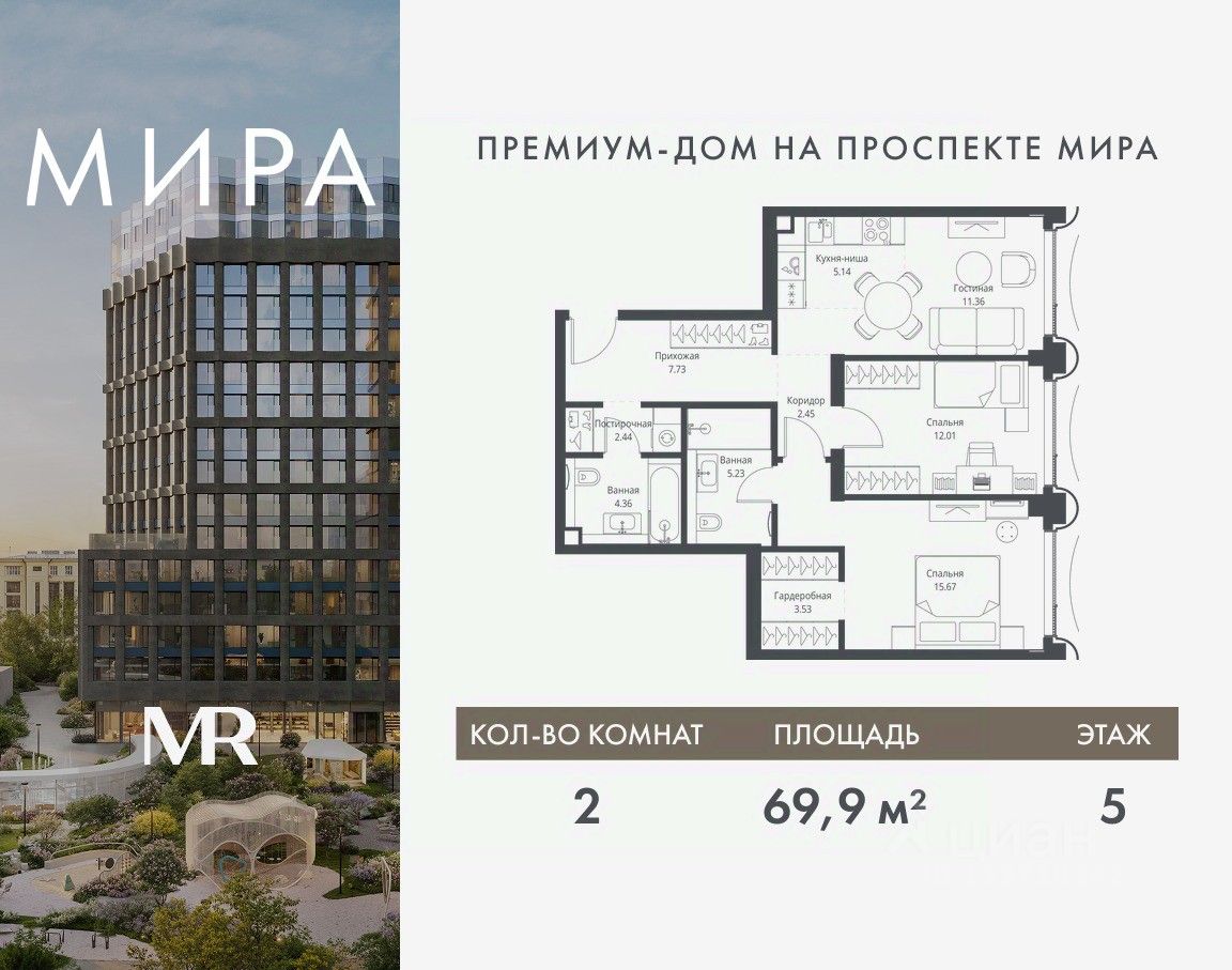Продаётся 2-комнатная квартира общей площадью 69.92 м² без отделки в доме премиум-класса МИРА на 5-м этаже 17 этажного дома. Квартира расположена в корпусе 1.