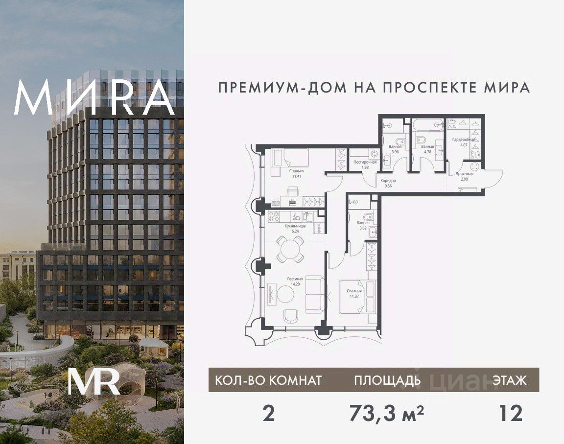Продаётся 2-комнатная квартира общей площадью 73.26 м² без отделки в доме премиум-класса МИRА на 12-м этаже 17 этажного дома. Квартира расположена в корпусе 1.