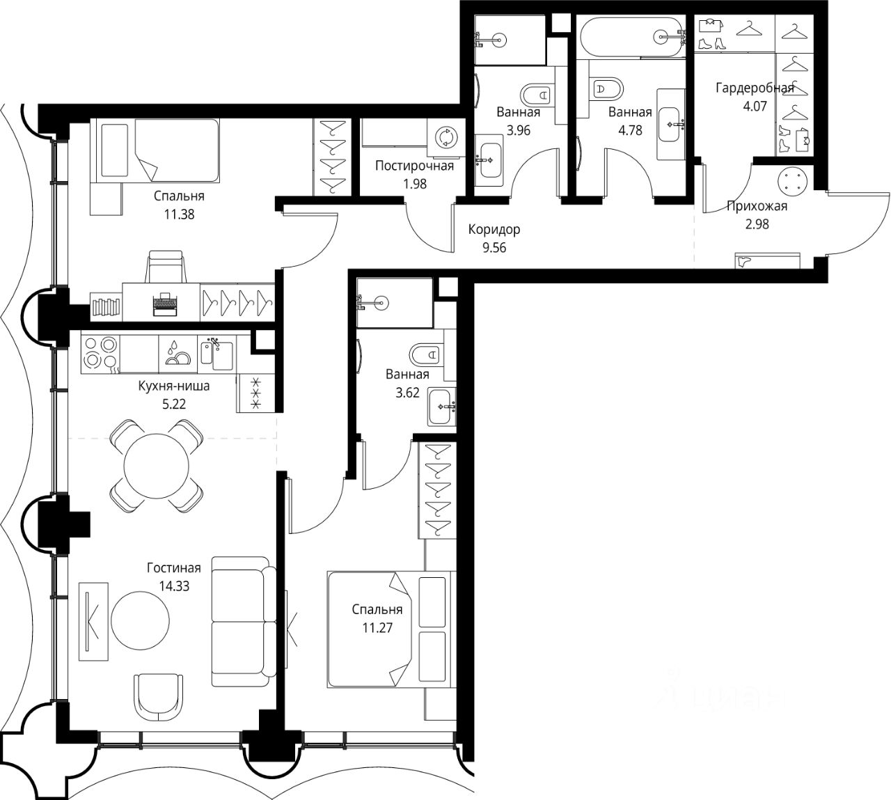 Продаётся 2-комнатная квартира общей площадью 73.15 м² без отделки в доме премиум-класса МИРА на 4-м этаже 17 этажного дома. Квартира расположена в корпусе 1.