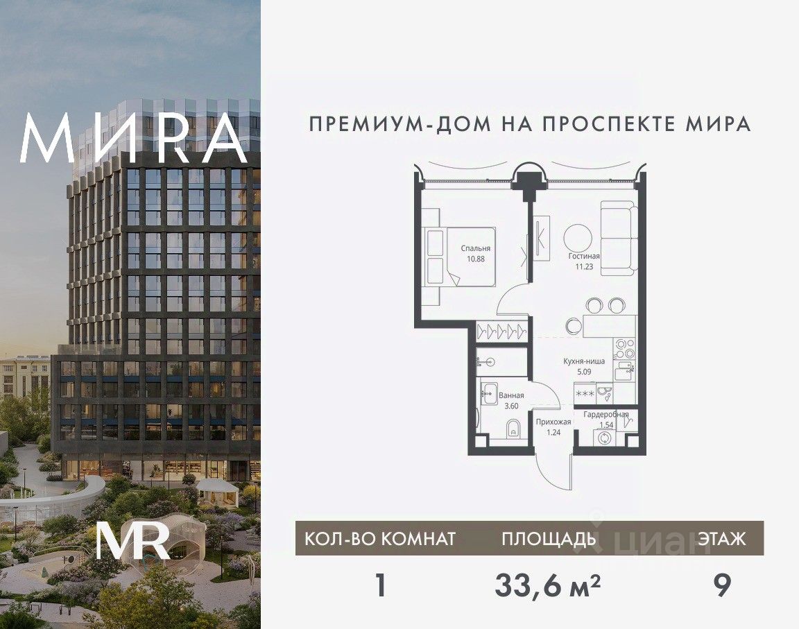 Продаётся 1-комнатная квартира общей площадью 33.58 м² без отделки в доме премиум-класса МИRА на 9-м этаже 17 этажного дома. Квартира расположена в корпусе 1.