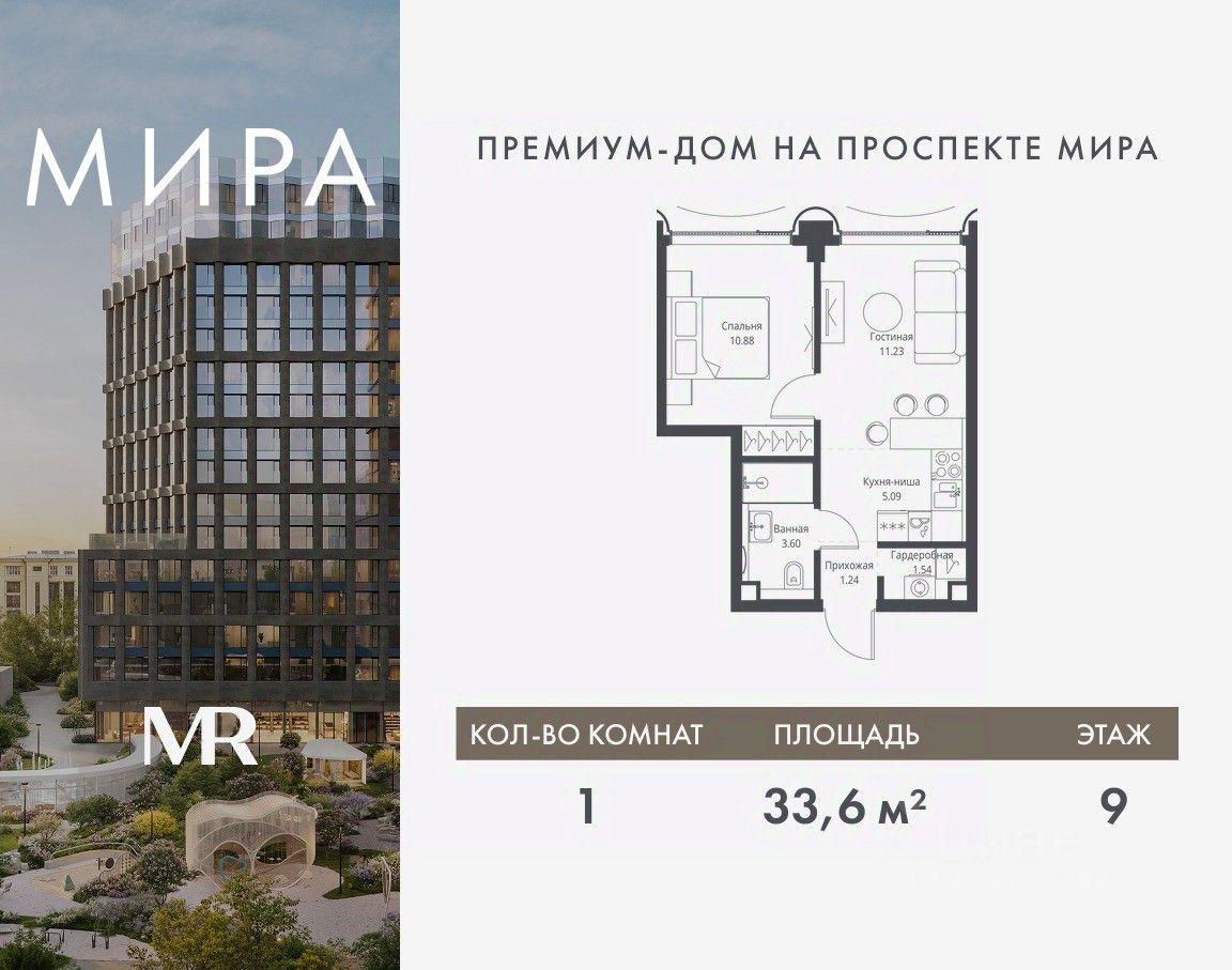 Продаётся 1-комнатная квартира общей площадью 33.58 м² без отделки в доме премиум-класса МИРА на 9-м этаже 17 этажного дома. Квартира расположена в корпусе 1.