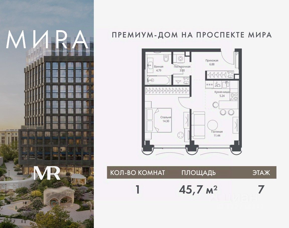 Продаётся 1-комнатная квартира общей площадью 45.65 м² без отделки в доме премиум-класса МИRА на 7-м этаже 17 этажного дома. Квартира расположена в корпусе 1.