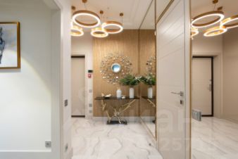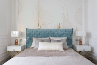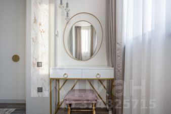 Просторный холл парадный - зеркала в латунном обрамлении, консоль с изножьем в виде золотых ветвей. Здесь же и вместительная гардеробная-постирочная. В кухне-гостиной белая бытовая техника в тон светлым фасадам. В зоне ТВ спрятана система хранения. Мягкая мебель настраивает наслаждаться уютом и эстетикой.