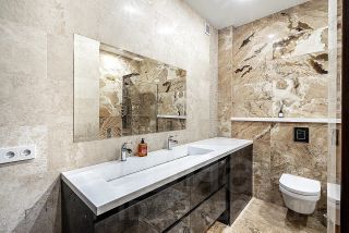 Санузел: Отделка натуральным травертином, стиральная машина и ванна с функцией душевой.