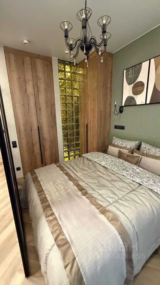 — Спальня отделена раздвижной перегородкой, с электрошторами на все панорамные окна