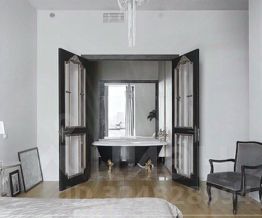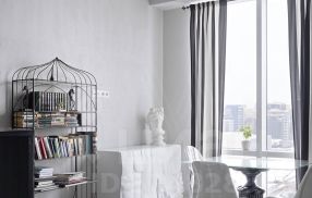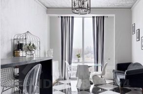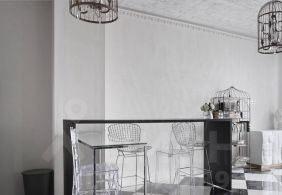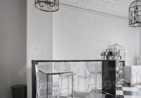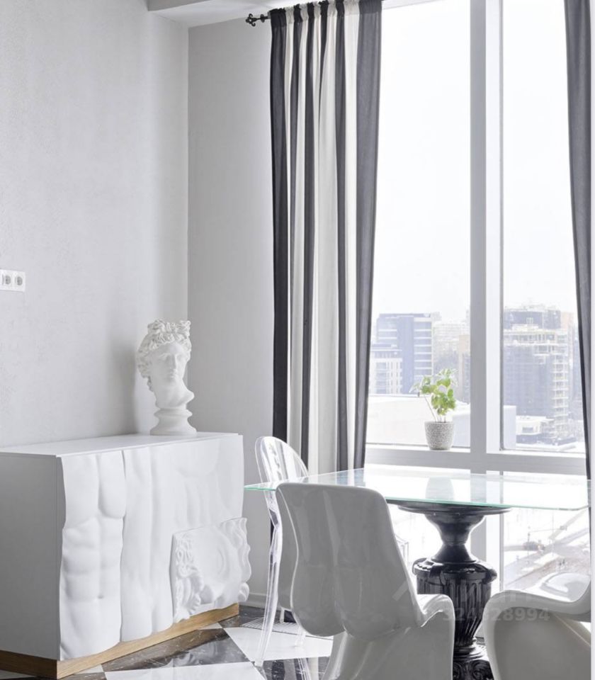 4) специально подобранную Мебель : стулья дизайна F.Noveber, повторяющие изгибы тела мужчины и женщины; барные стулья F.Starck; мягкая мебель ( диван, кровать, кресла) из Италии ; антикварный комод на кухне и круглый стол из Бельгии и Франции . Мебель на фото стоит в разных вариантах расстановки.