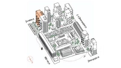 Визуально квартал разделен на две части: верхний город с новыми высотными жилыми домами и нижний город с общественным пространством для инфраструктуры, где будет располагаться новый социокультурный кластер площадью около 10 000 кв. м.