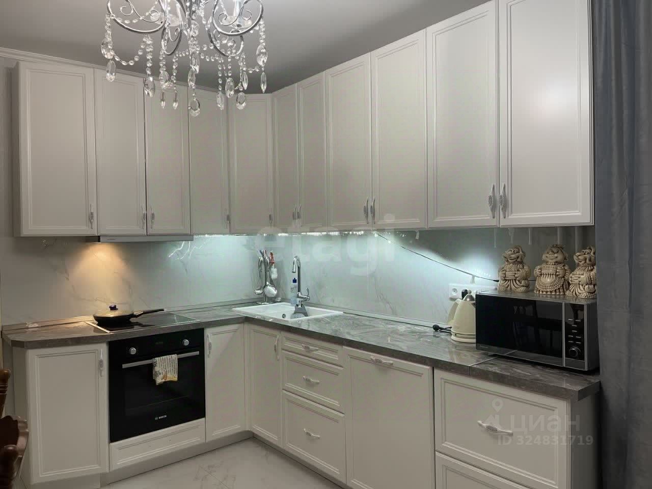 остаётся новый большой кухонный гарнитур — современная функциональная мебель, которая сэкономит вам время и деньги.