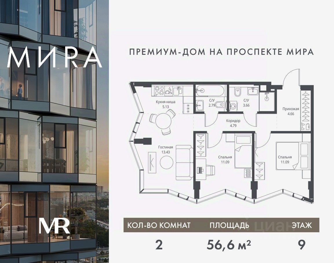 Продаётся 2-комнатная квартира общей площадью 56.64 м² без отделки в доме премиум-класса МИRА на 9-м этаже 24 этажного дома. Квартира расположена в корпусе 3.