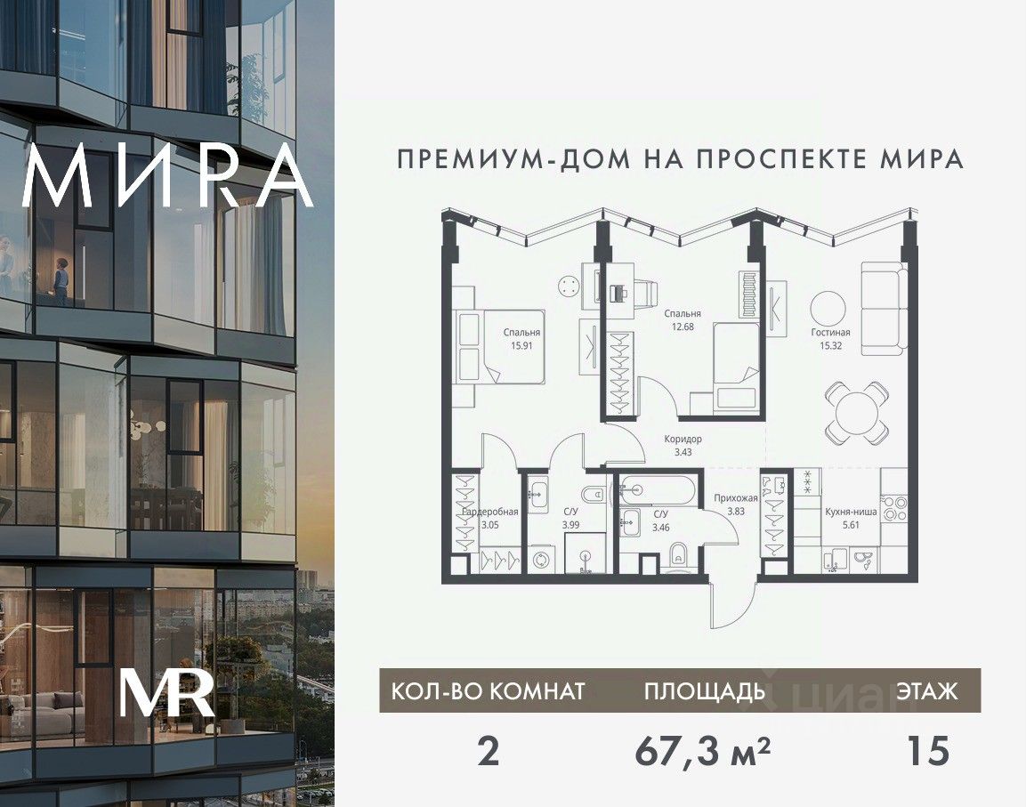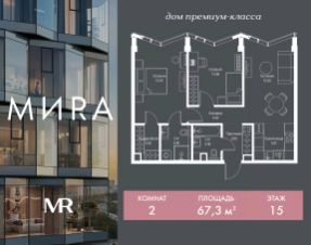 Продаётся 2-комнатная квартира общей площадью 67.28 м² без отделки в доме премиум-класса МИRА на 15-м этаже 24 этажного дома. Квартира расположена в корпусе 3.