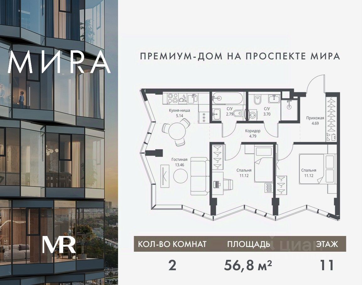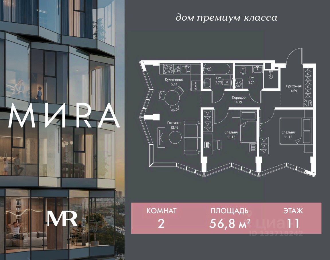 Продаётся 2-комнатная квартира общей площадью 56.81 м² без отделки в доме премиум-класса МИRА на 11-м этаже 24 этажного дома. Квартира расположена в корпусе 3.