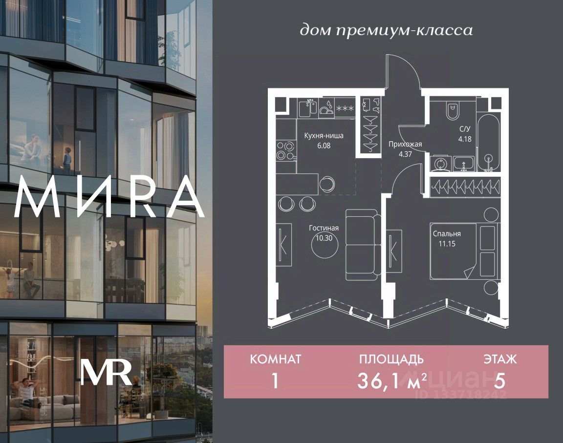 Продаётся 1-комнатная квартира общей площадью 36.08 м² без отделки в доме премиум-класса МИRА на 5-м этаже 24 этажного дома. Квартира расположена в корпусе 3.