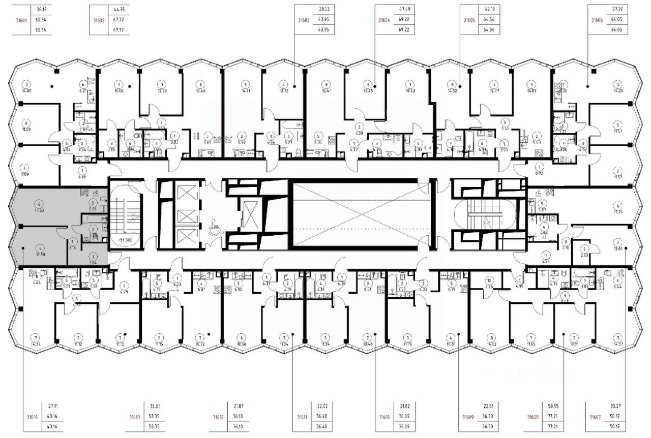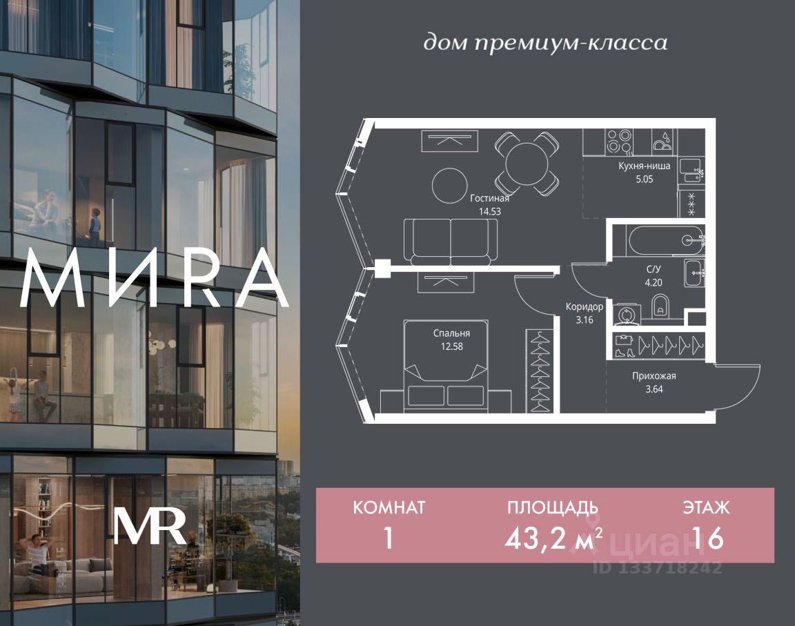 Продаётся 1-комнатная квартира общей площадью 43.16 м² без отделки в доме премиум-класса МИRА на 16-м этаже 24 этажного дома. Квартира расположена в корпусе 3.