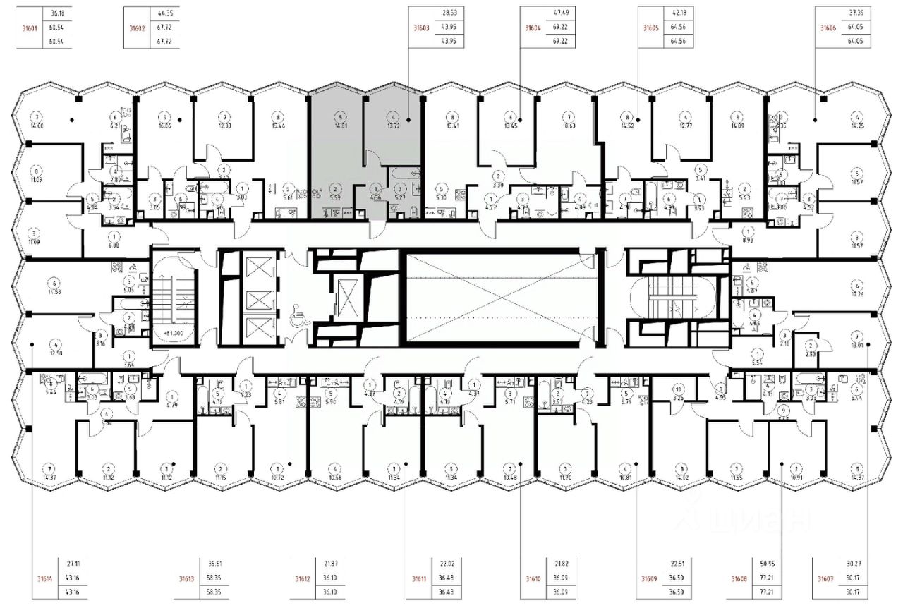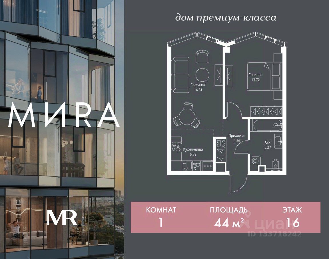 Продаётся 1-комнатная квартира общей площадью 43.95 м² без отделки в доме премиум-класса МИRА на 16-м этаже 24 этажного дома. Квартира расположена в корпусе 3.