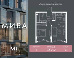 Продаётся 1-комнатная квартира общей площадью 35.68 м² без отделки в доме премиум-класса МИRА на 3-м этаже 24 этажного дома. Квартира расположена в корпусе 3.