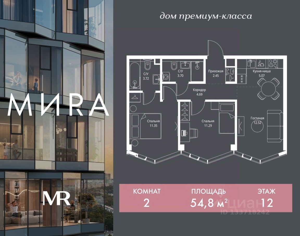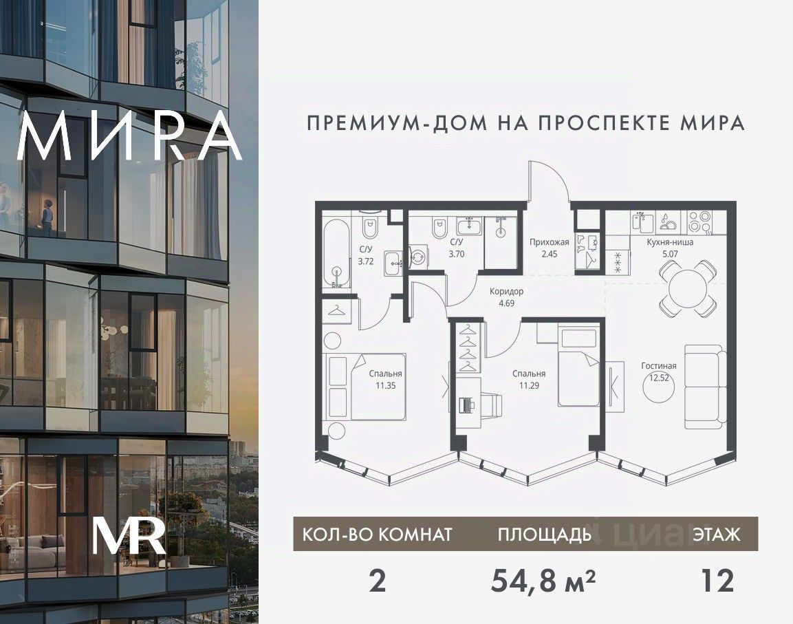 Продаётся 2-комнатная квартира общей площадью 54.79 м² без отделки в доме премиум-класса МИRА на 12-м этаже 24 этажного дома. Квартира расположена в корпусе 3.