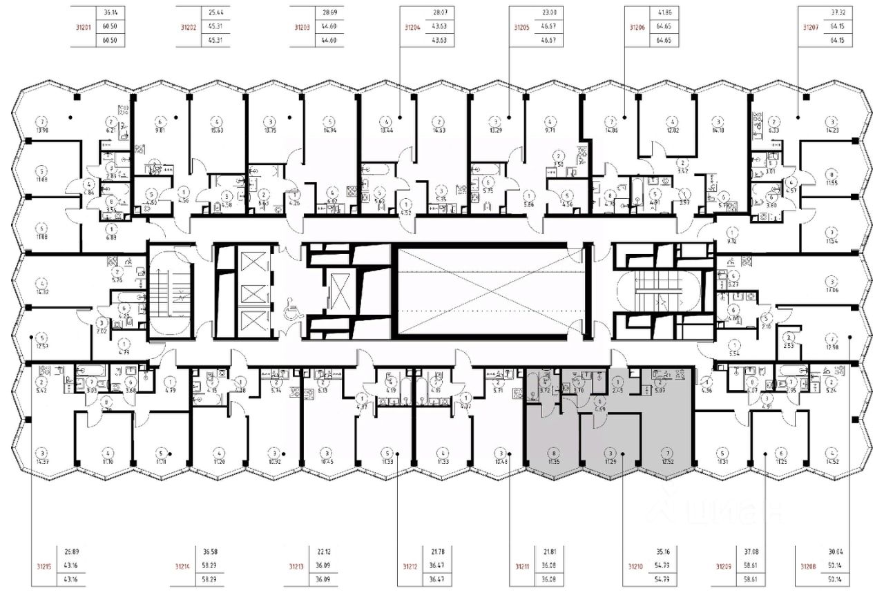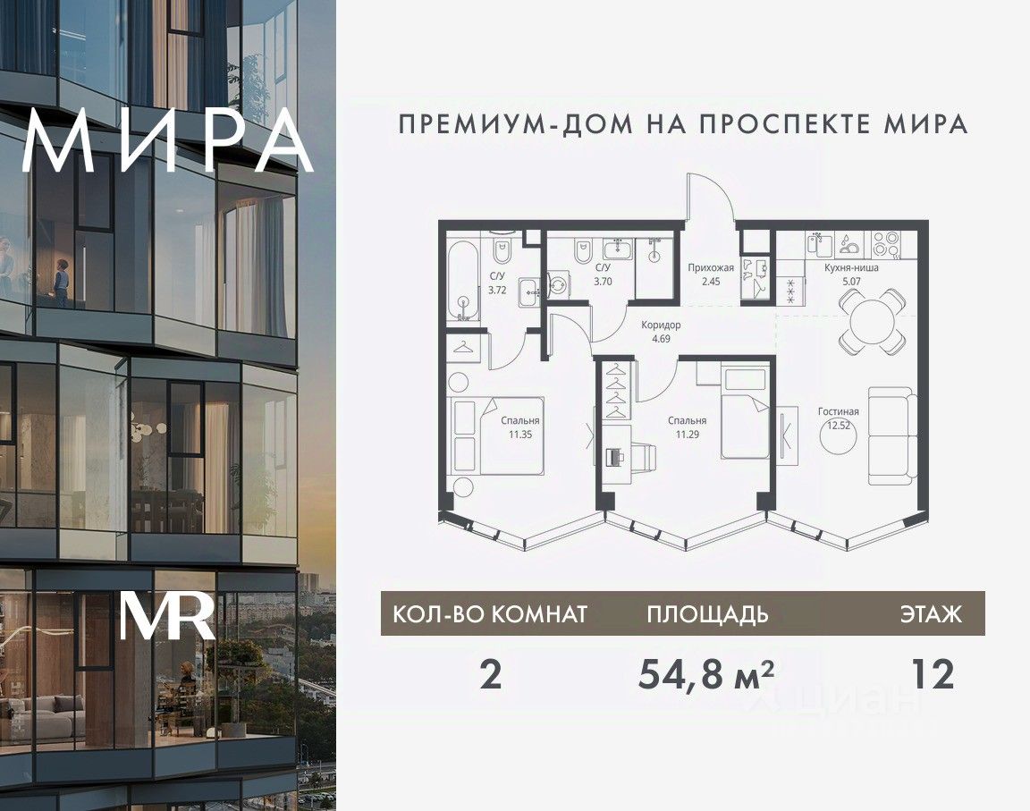 Продаётся 2-комнатная квартира общей площадью 54.79 м² без отделки в доме премиум-класса МИРА на 12-м этаже 24 этажного дома. Квартира расположена в корпусе 3.