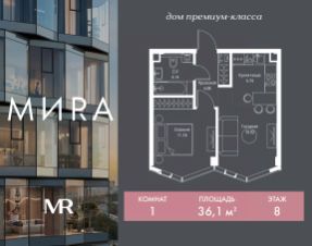 Продаётся 1-комнатная квартира общей площадью 36.06 м² без отделки в доме премиум-класса МИRА на 8-м этаже 24 этажного дома. Квартира расположена в корпусе 3.