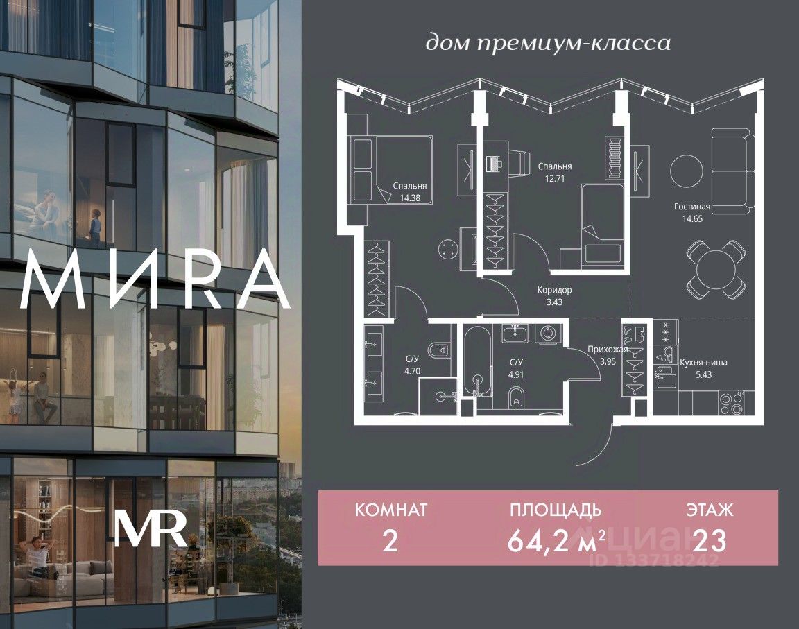 Продаётся 2-комнатная квартира общей площадью 64.16 м² без отделки в доме премиум-класса МИRА на 23-м этаже 24 этажного дома. Квартира расположена в корпусе 3.