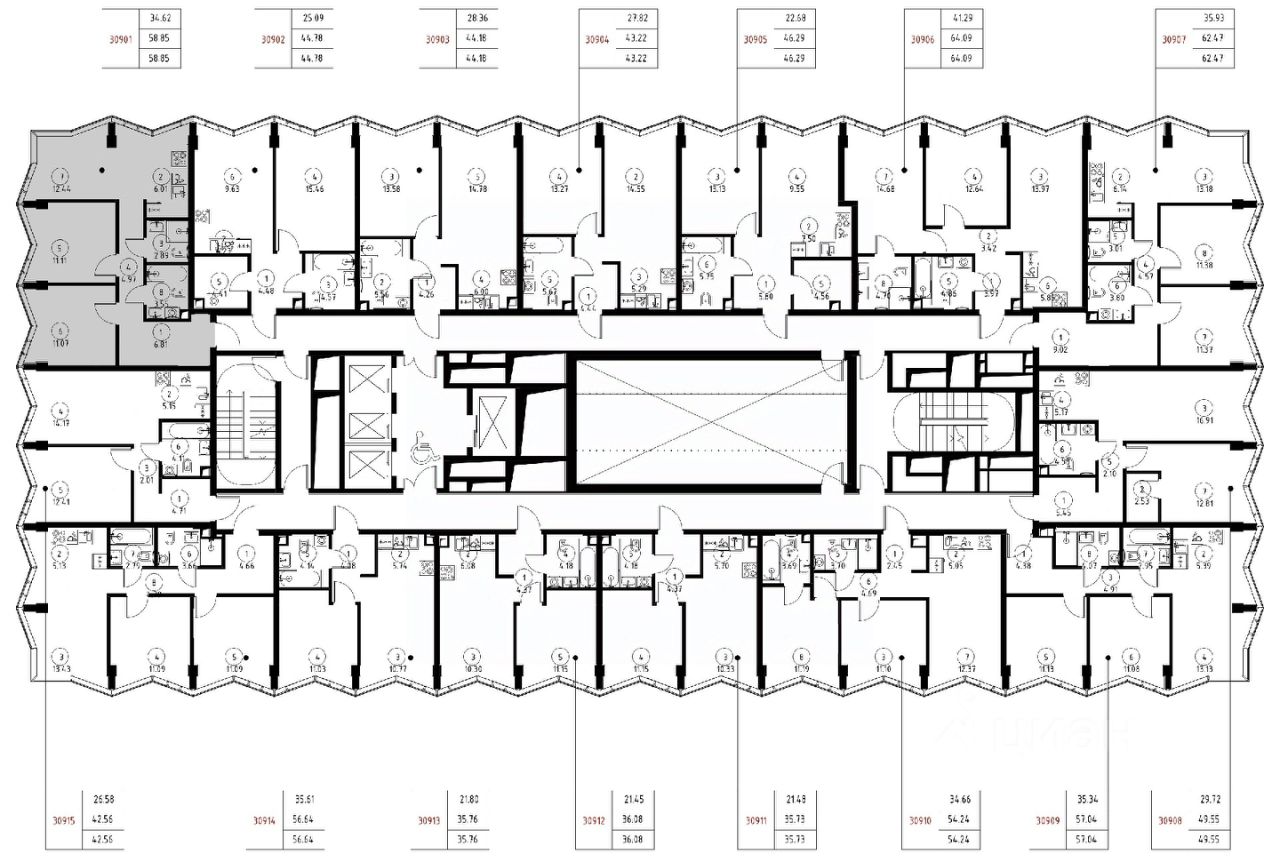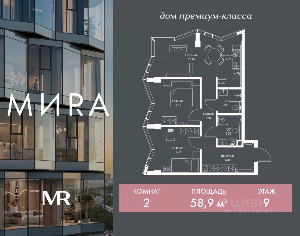 Продаётся 2-комнатная квартира общей площадью 58.85 м² без отделки в доме премиум-класса МИRА на 9-м этаже 24 этажного дома. Квартира расположена в корпусе 3.