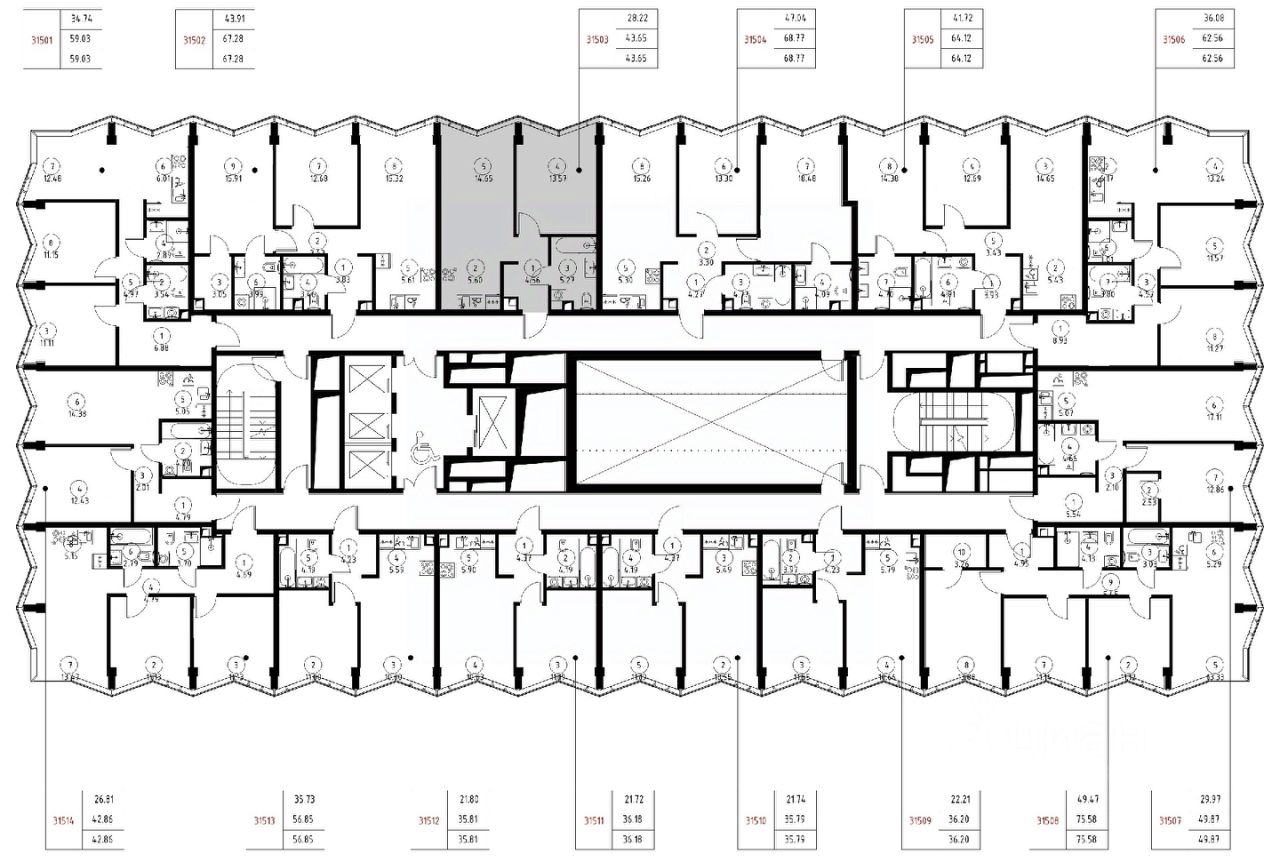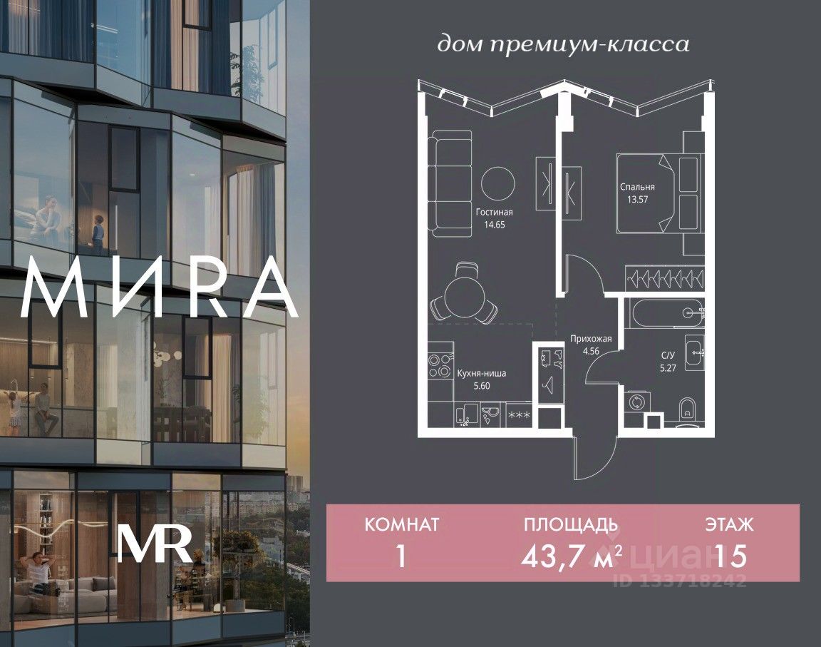 Продаётся 1-комнатная квартира общей площадью 43.65 м² без отделки в доме премиум-класса МИRА на 15-м этаже 24 этажного дома. Квартира расположена в корпусе 3.