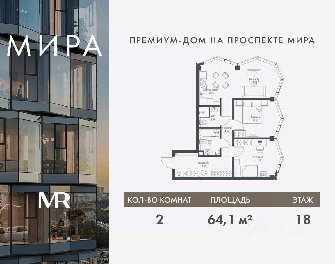 Продаётся 2-комнатная квартира общей площадью 64.05 м² без отделки в доме премиум-класса МИРА на 18-м этаже 24 этажного дома. Квартира расположена в корпусе 3.