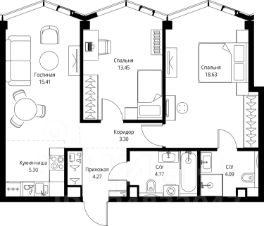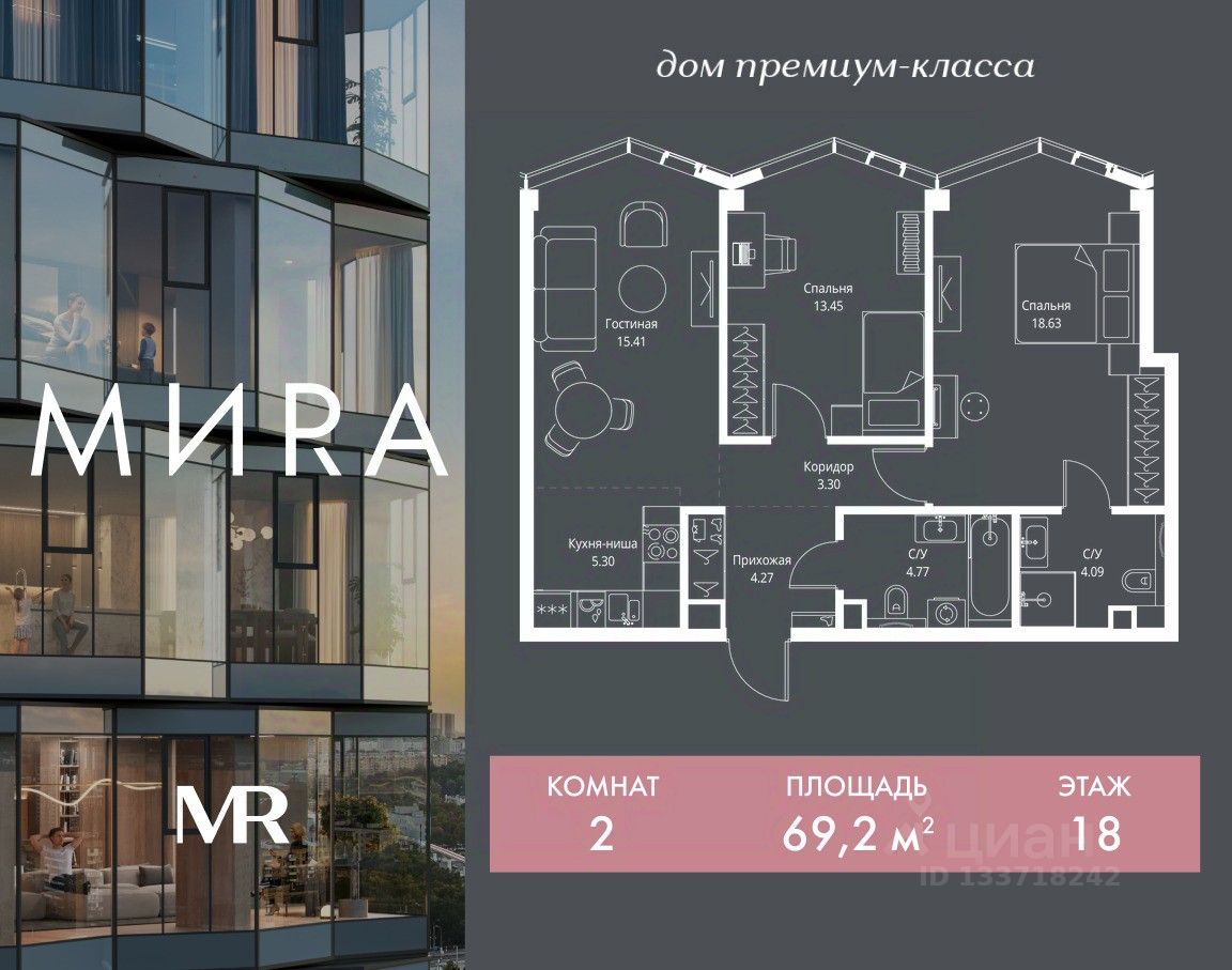 Продаётся 2-комнатная квартира общей площадью 69.22 м² без отделки в доме премиум-класса МИRА на 18-м этаже 24 этажного дома. Квартира расположена в корпусе 3.