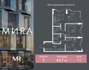 Продаётся 2-комнатная квартира общей площадью 62.67 м² без отделки в доме премиум-класса МИRА на 11-м этаже 24 этажного дома. Квартира расположена в корпусе 3.