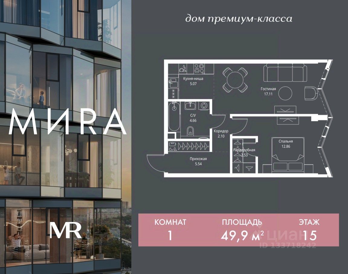 Продаётся 1-комнатная квартира общей площадью 49.87 м² без отделки в доме премиум-класса МИRА на 15-м этаже 24 этажного дома. Квартира расположена в корпусе 3.