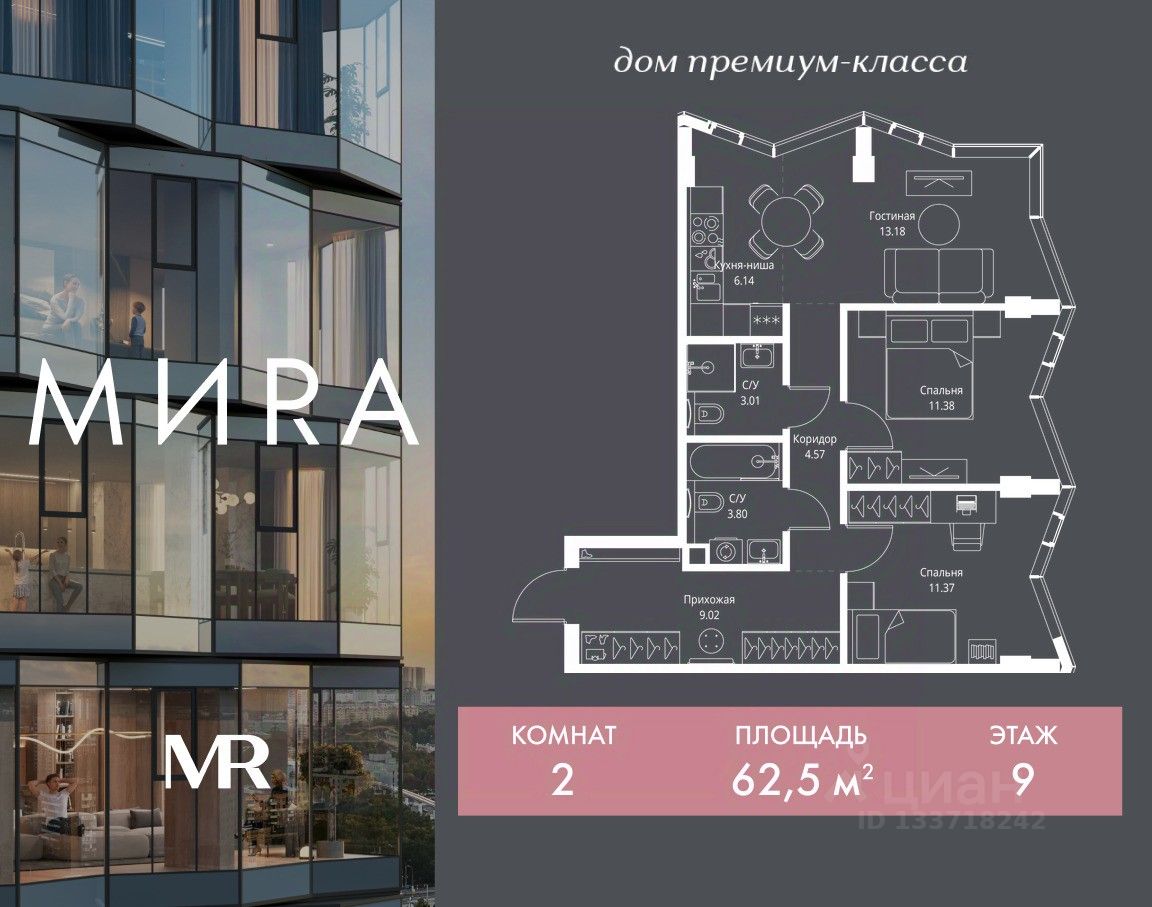 Продаётся 2-комнатная квартира общей площадью 62.47 м² без отделки в доме премиум-класса МИRА на 9-м этаже 24 этажного дома. Квартира расположена в корпусе 3.