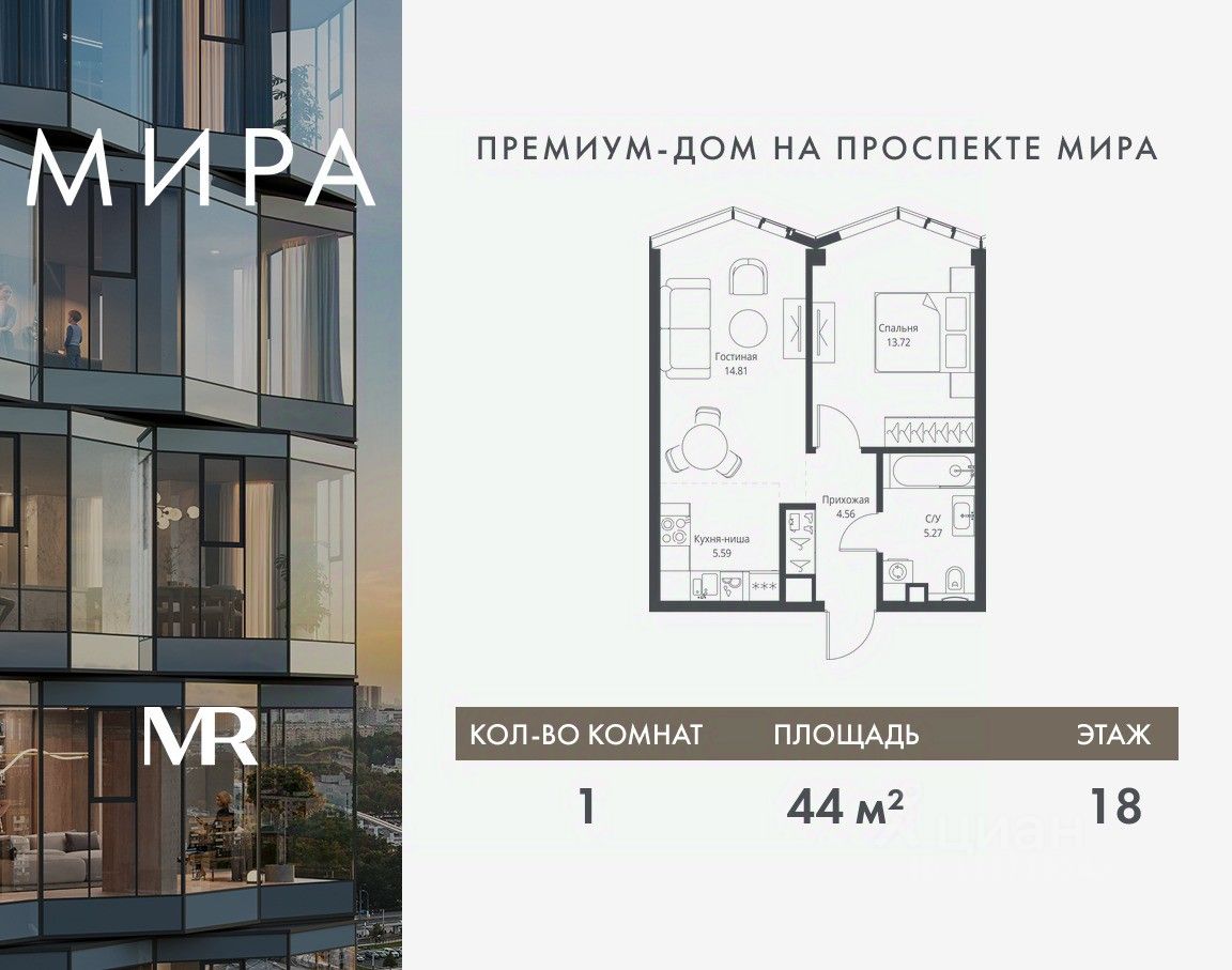Продаётся 1-комнатная квартира общей площадью 43.95 м² без отделки в доме премиум-класса МИРА на 18-м этаже 24 этажного дома. Квартира расположена в корпусе 3.