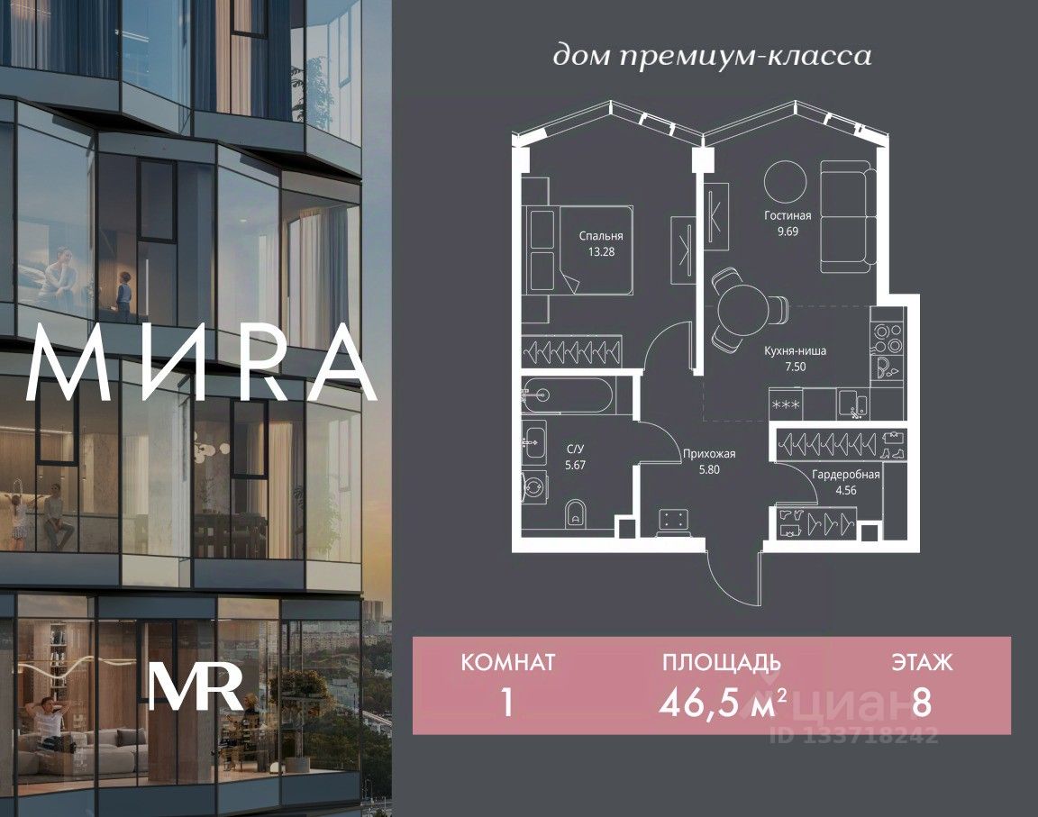 Продаётся 1-комнатная квартира общей площадью 46.50 м² без отделки в доме премиум-класса МИRА на 8-м этаже 24 этажного дома. Квартира расположена в корпусе 3.
