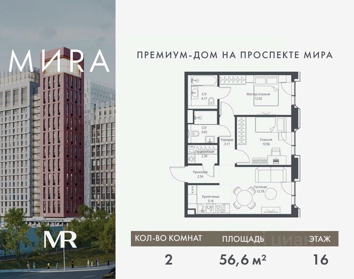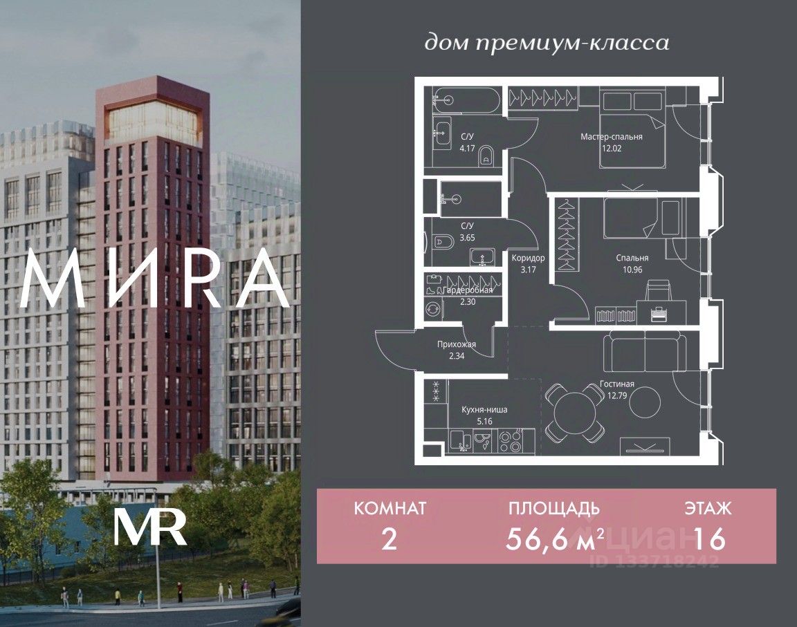 Продаётся 2-комнатная квартира общей площадью 56.56 м² без отделки в доме премиум-класса МИRА на 16-м этаже 23 этажного дома. Квартира расположена в корпусе 2.