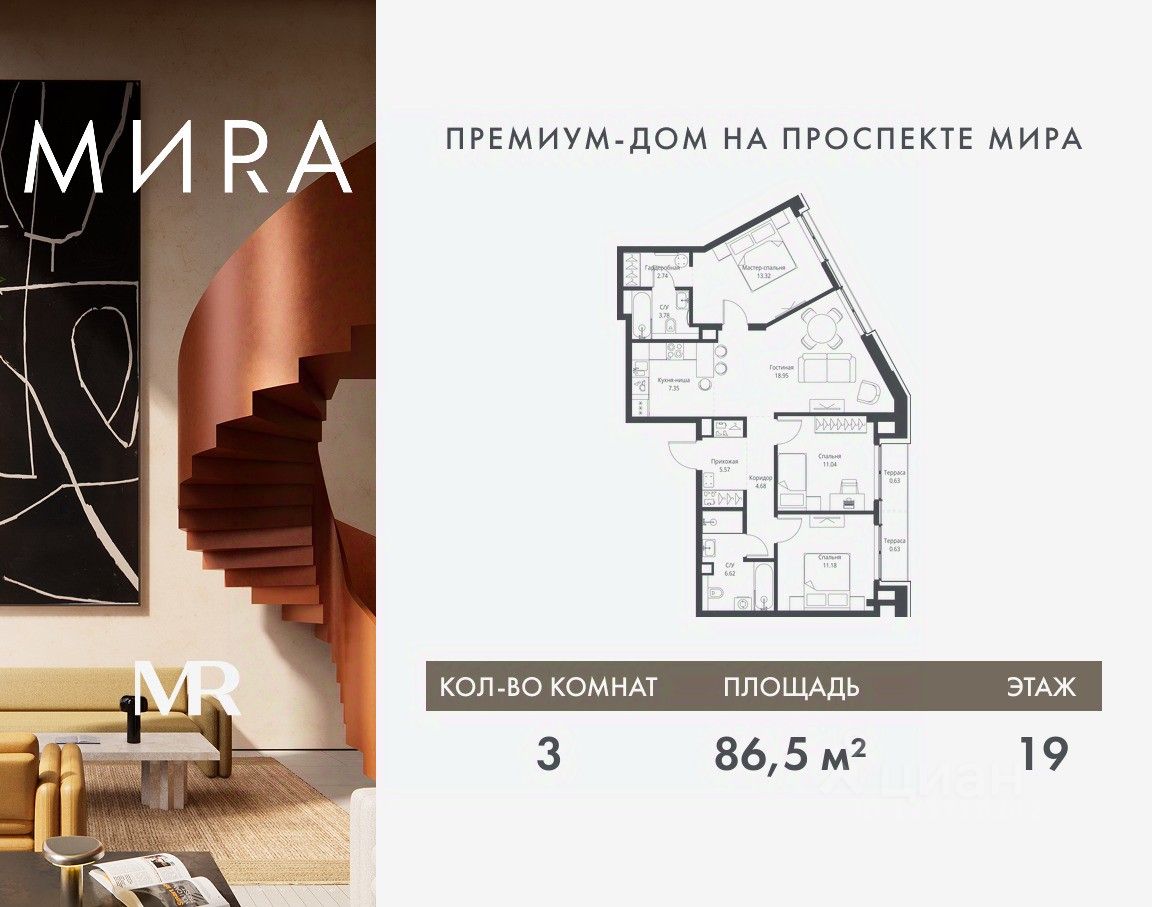 Продаётся 3-комнатная квартира общей площадью 86.49 м² без отделки в доме премиум-класса МИRА на 19-м этаже 23 этажного дома. Квартира расположена в корпусе 2.