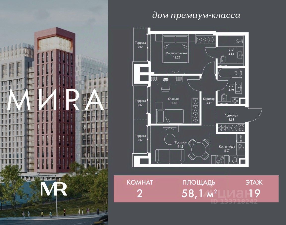 Продаётся 2-комнатная квартира общей площадью 58.06 м² без отделки в доме премиум-класса МИRА на 19-м этаже 23 этажного дома. Квартира расположена в корпусе 2.