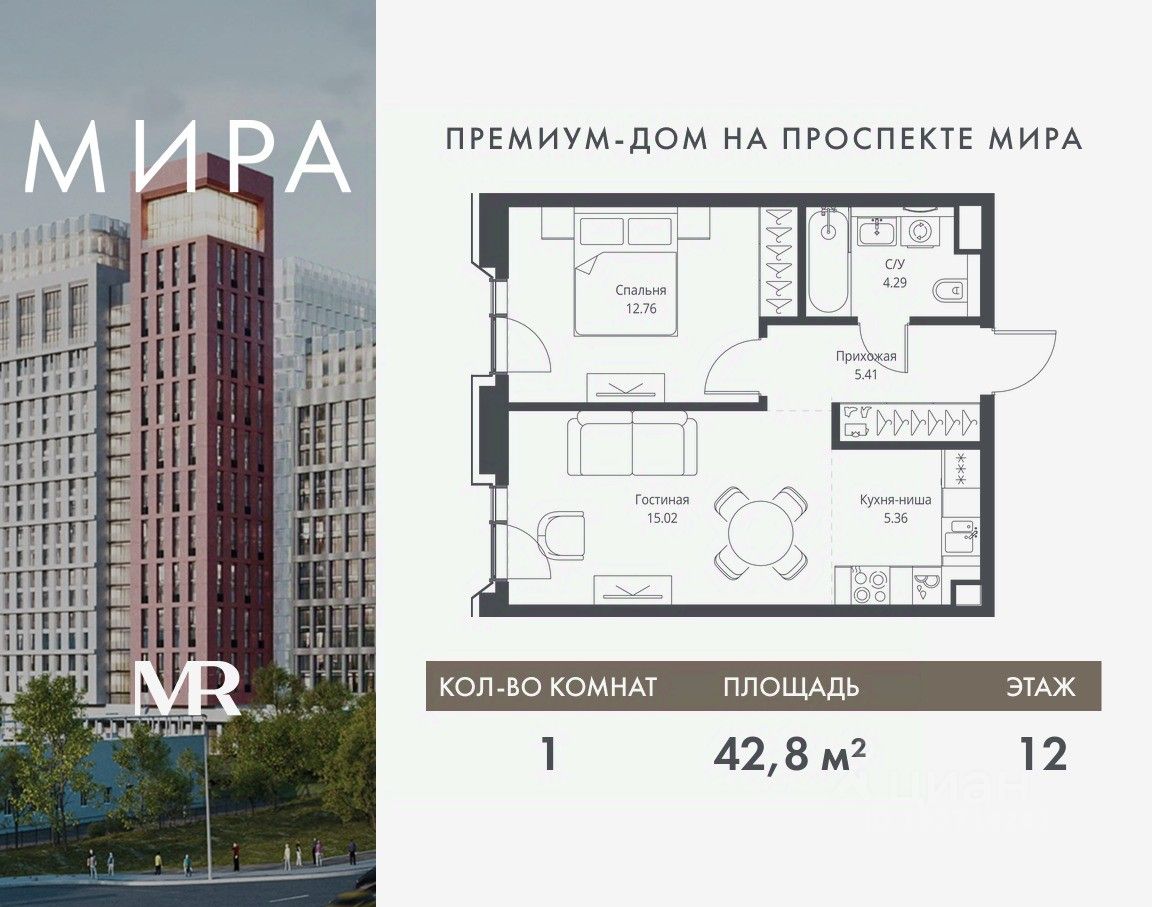Продаётся 1-комнатная квартира общей площадью 42.84 м² без отделки в доме премиум-класса МИРА на 12-м этаже 23 этажного дома. Квартира расположена в корпусе 2.