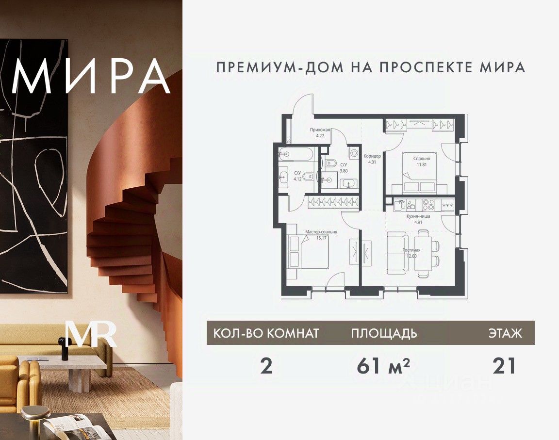 Продаётся 2-комнатная квартира общей площадью 60.99 м² без отделки в доме премиум-класса МИРА на 21-м этаже 23 этажного дома. Квартира расположена в корпусе 2.