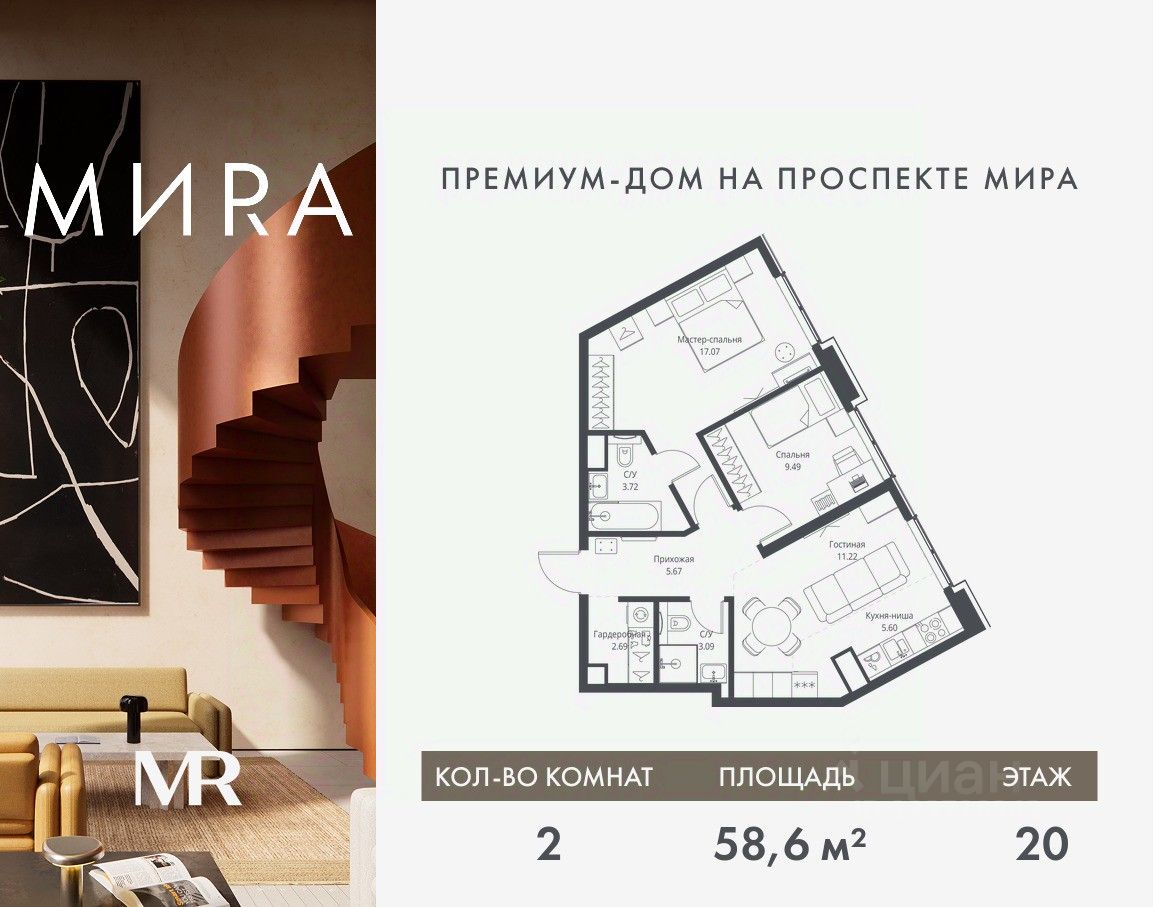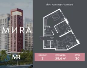 Продаётся 2-комнатная квартира общей площадью 58.55 м² без отделки в доме премиум-класса МИRА на 20-м этаже 23 этажного дома. Квартира расположена в корпусе 2.