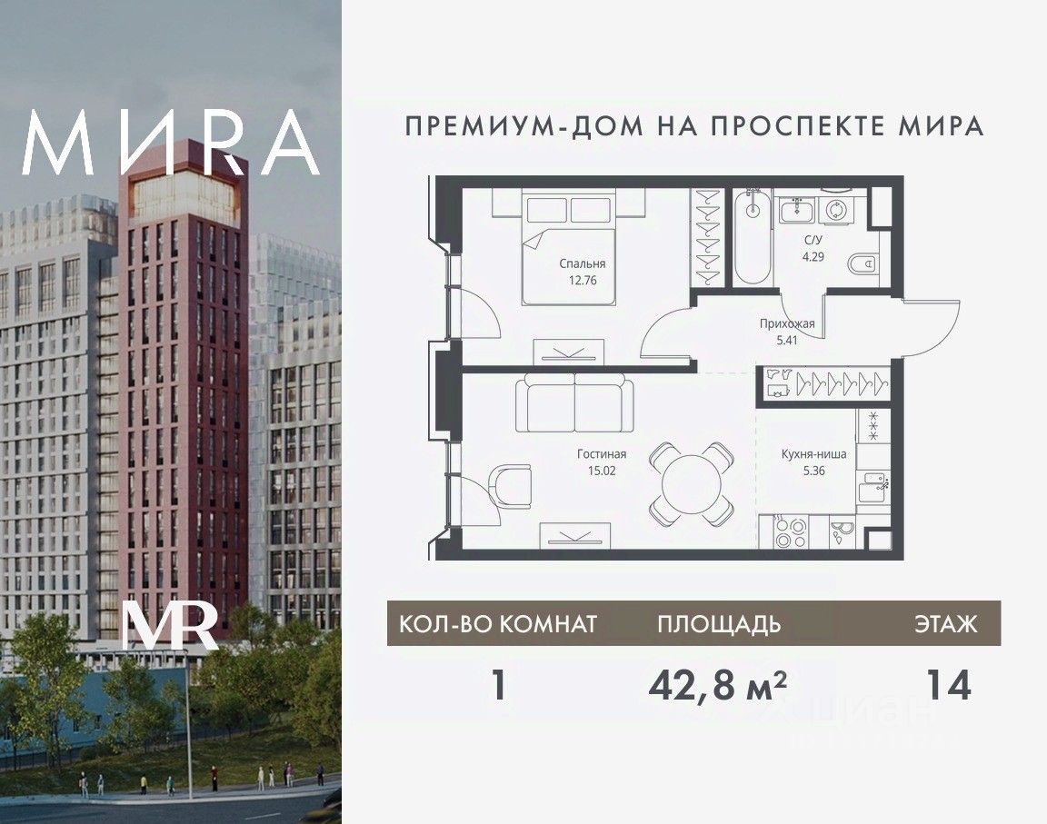 Продаётся 1-комнатная квартира общей площадью 42.84 м² без отделки в доме премиум-класса МИRА на 14-м этаже 23 этажного дома. Квартира расположена в корпусе 2.