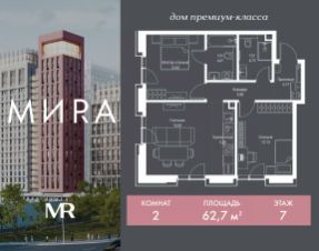 Продаётся 2-комнатная квартира общей площадью 62.70 м² без отделки в доме премиум-класса МИRА на 7-м этаже 23 этажного дома. Квартира расположена в корпусе 2.
