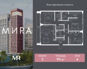 Продаётся 3-комнатная квартира общей площадью 90.03 м² без отделки в доме премиум-класса МИRА на 4-м этаже 23 этажного дома. Квартира расположена в корпусе 2.