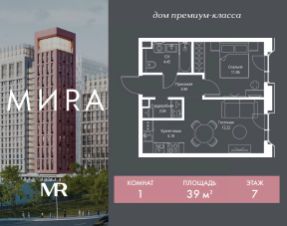 Продаётся 1-комнатная квартира общей площадью 38.95 м² без отделки в доме премиум-класса МИRА на 7-м этаже 23 этажного дома. Квартира расположена в корпусе 2.