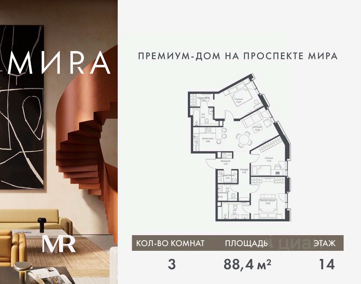 Продаётся 3-комнатная квартира общей площадью 88.44 м² без отделки в доме премиум-класса МИRА на 14-м этаже 23 этажного дома. Квартира расположена в корпусе 2.