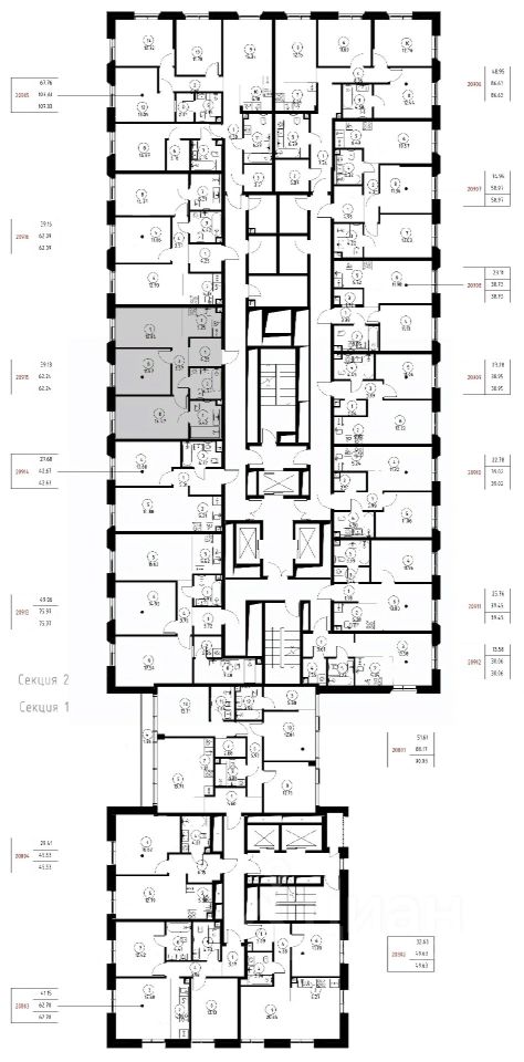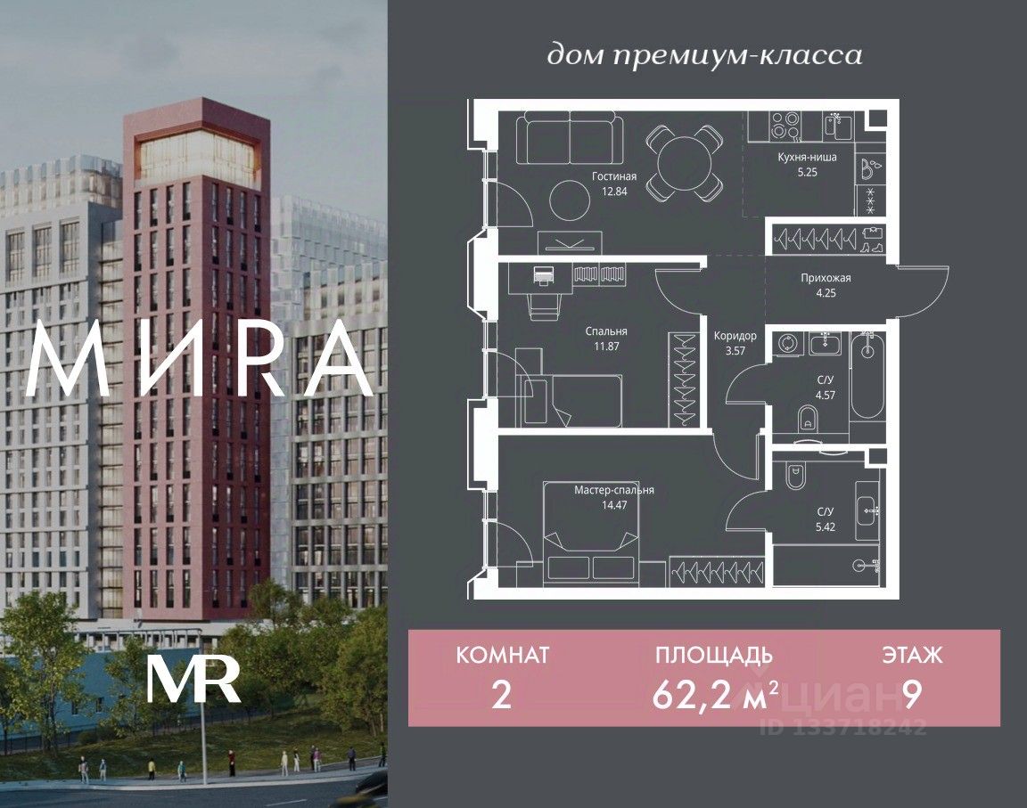 Продаётся 2-комнатная квартира общей площадью 62.24 м² без отделки в доме премиум-класса МИRА на 9-м этаже 23 этажного дома. Квартира расположена в корпусе 2.