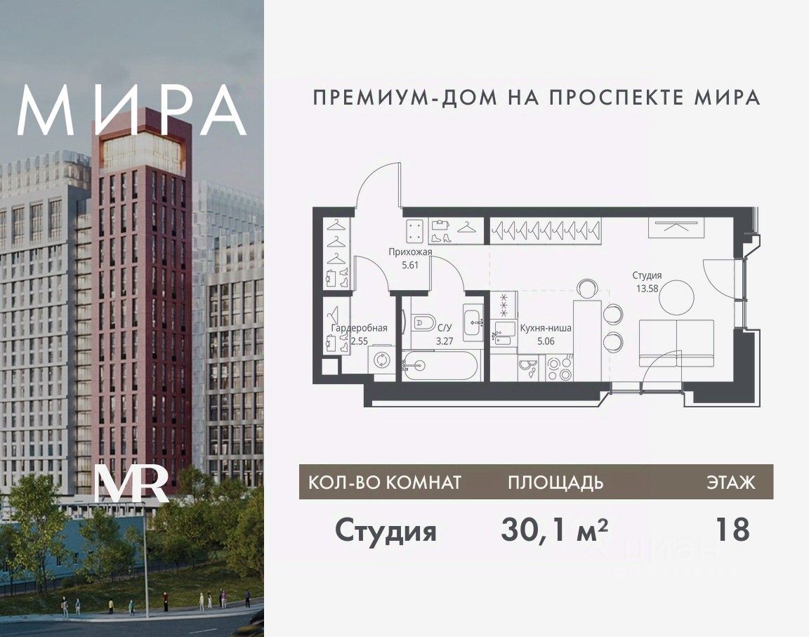 Продаётся студия общей площадью 30.07 м² без отделки в доме премиум-класса МИРА на 18-м этаже 23 этажного дома. Квартира расположена в корпусе 2.