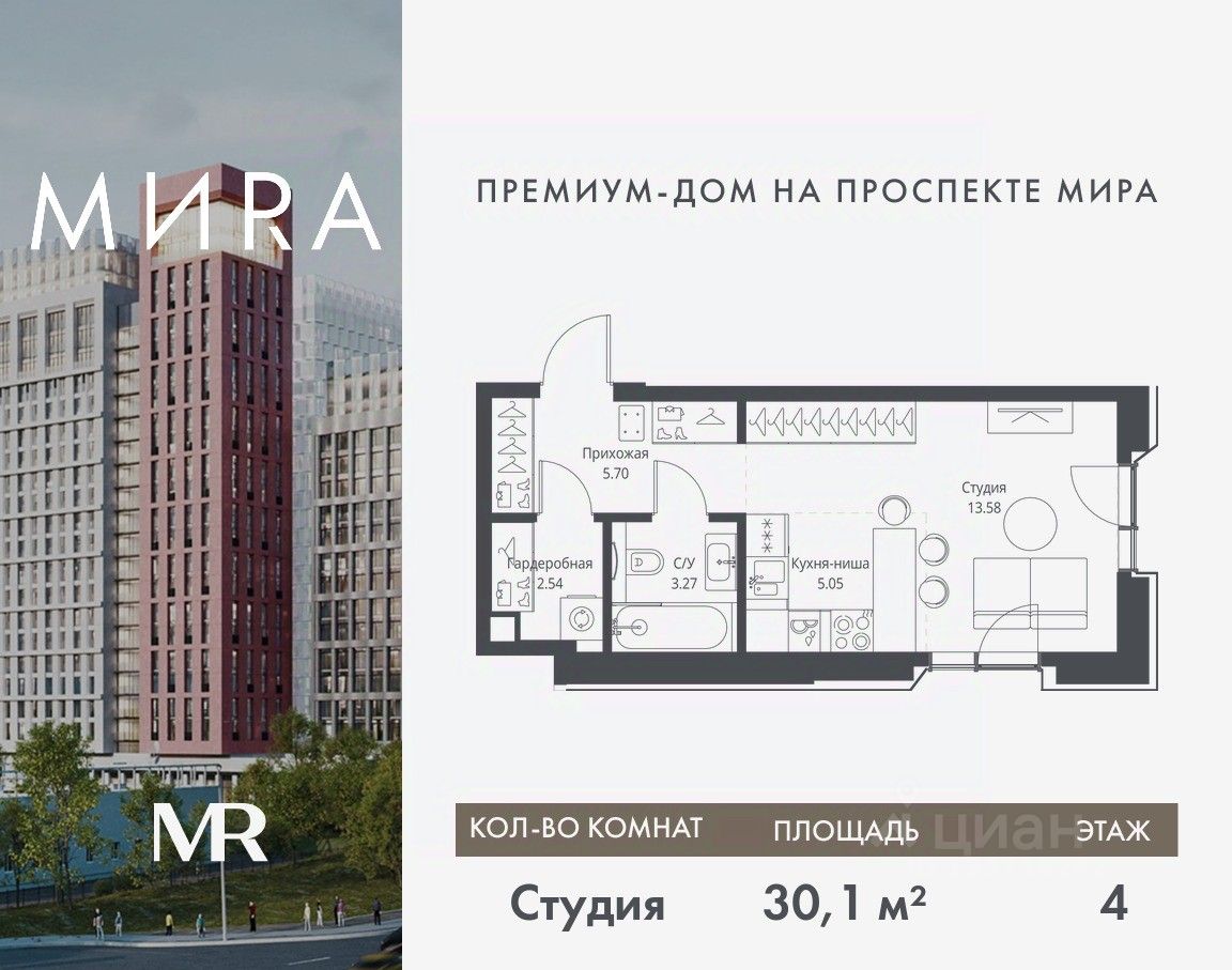 Продаётся студия общей площадью 30.14 м² без отделки в доме премиум-класса МИRА на 4-м этаже 23 этажного дома. Квартира расположена в корпусе 2.