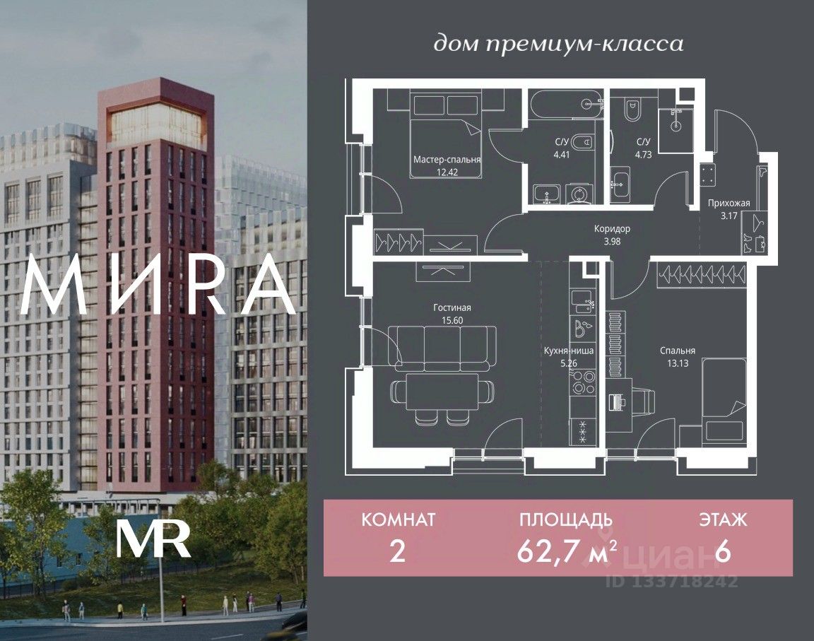 Продаётся 2-комнатная квартира общей площадью 62.70 м² без отделки в доме премиум-класса МИRА на 6-м этаже 23 этажного дома. Квартира расположена в корпусе 2.