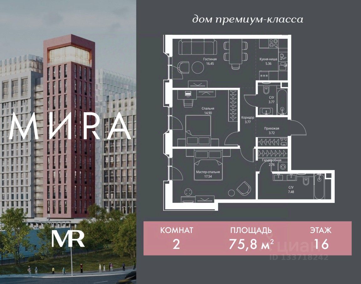 Продаётся 2-комнатная квартира общей площадью 75.75 м² без отделки в доме премиум-класса МИRА на 16-м этаже 23 этажного дома. Квартира расположена в корпусе 2.